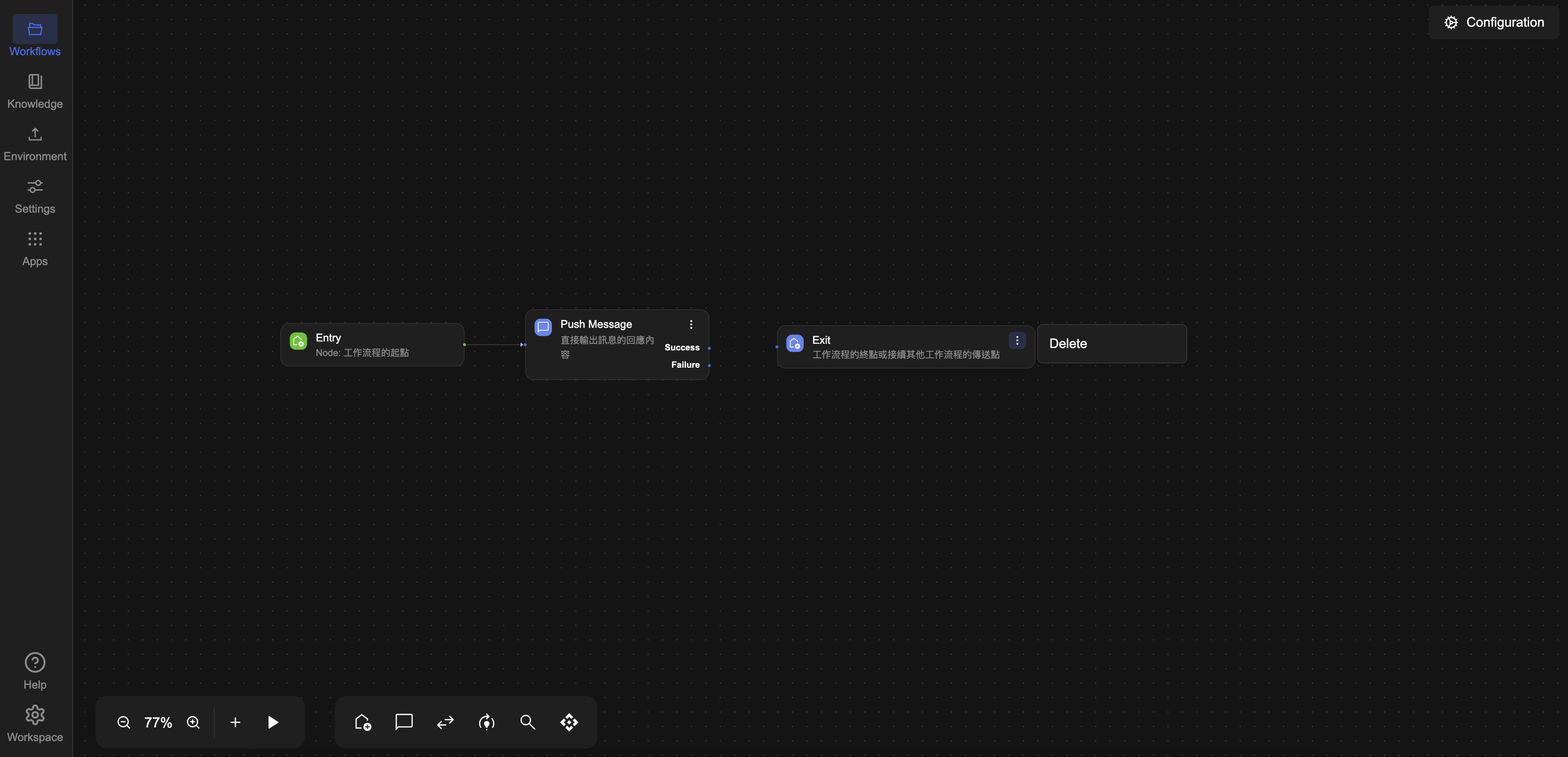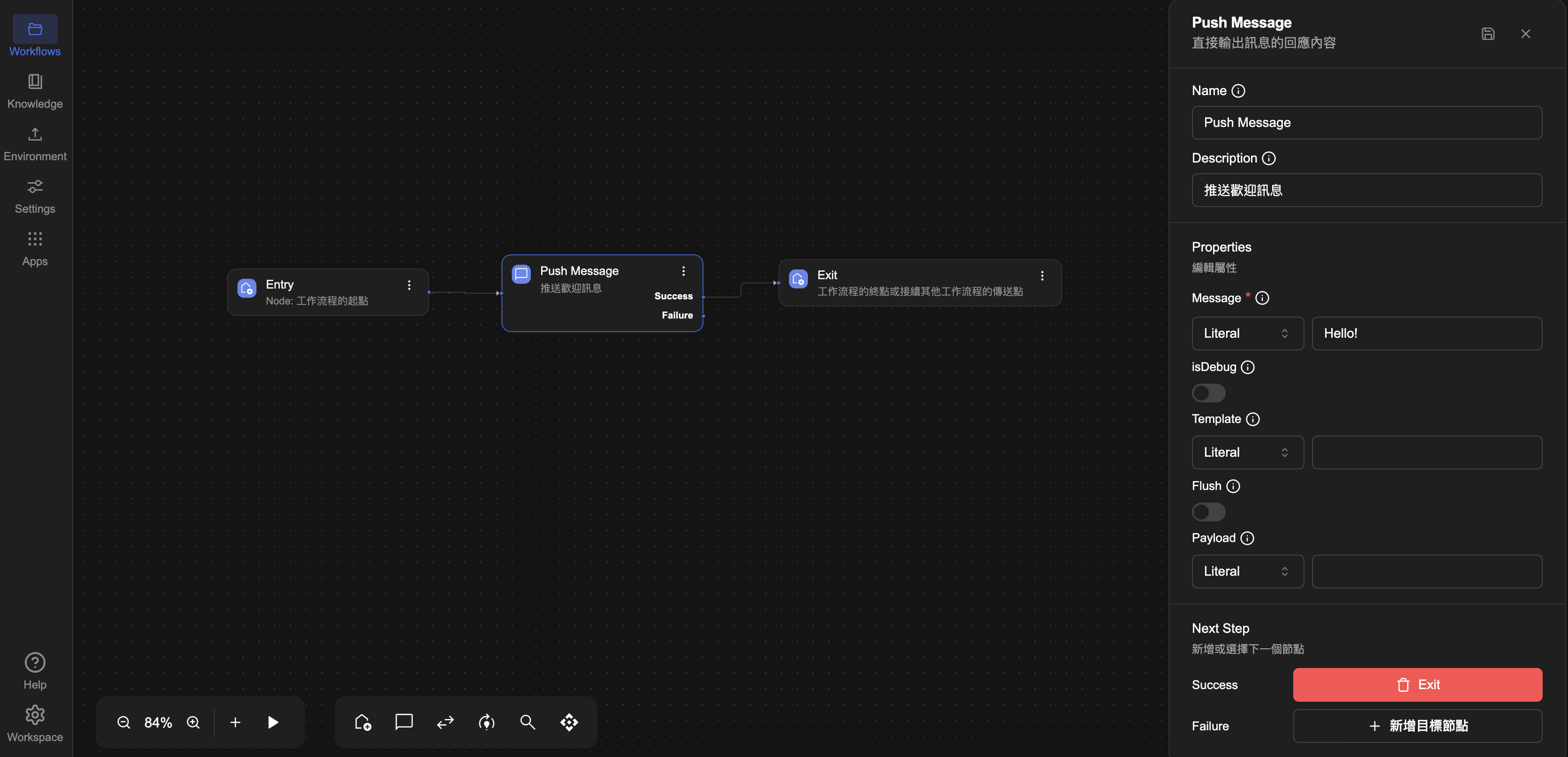 • 點選 Exit 節點Push Message 節點之間的連接線,按下鍵盤的 DeleteBackspace 鍵進行刪除。