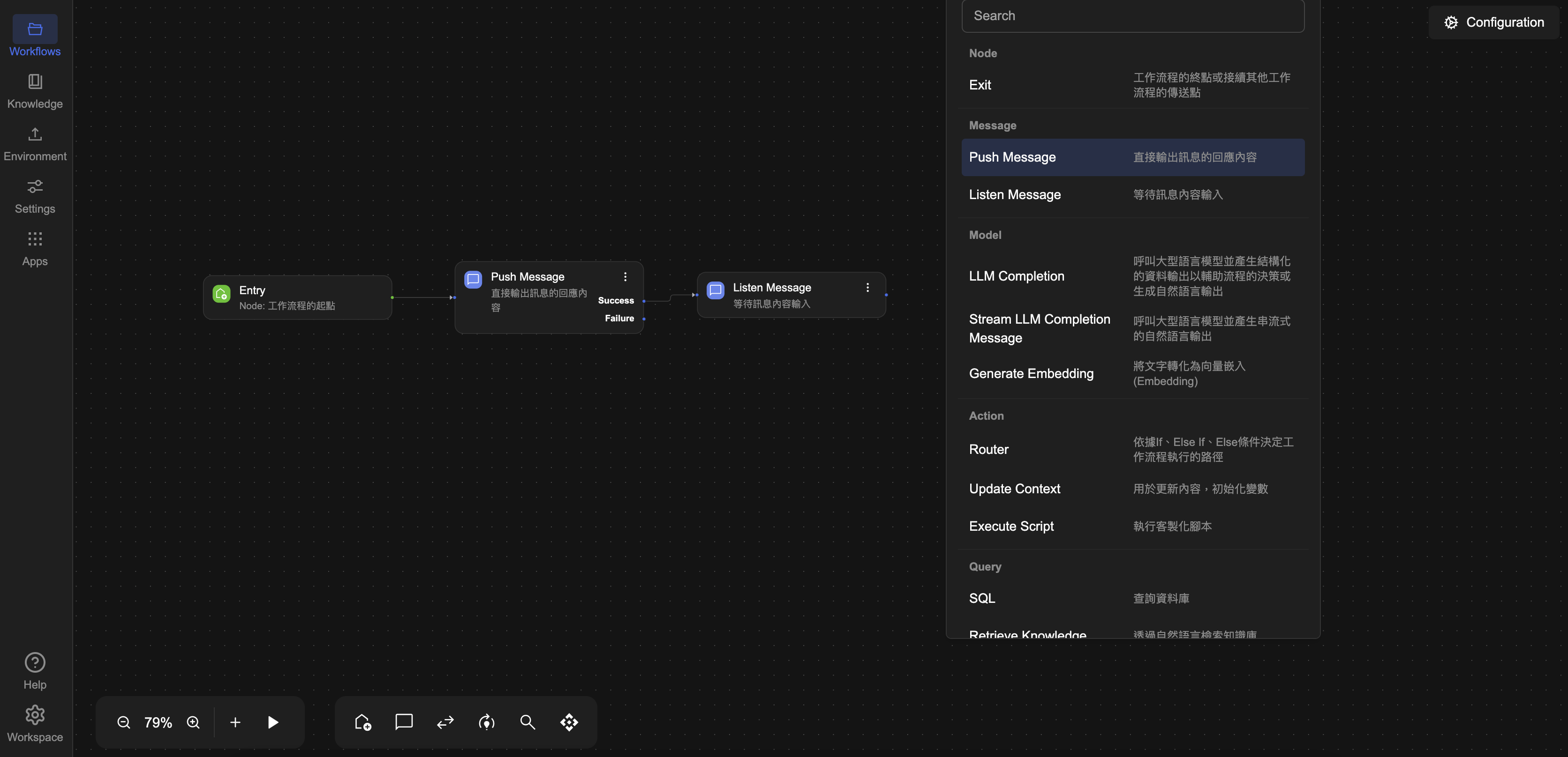 點選畫面左下方的 + Add Processor 按鈕,從節點清單中選擇 Listen Message。新增後,Listen Message 節點方塊將出現在工作流程編輯畫面中,串接於 Push MessageSuccess 之後。