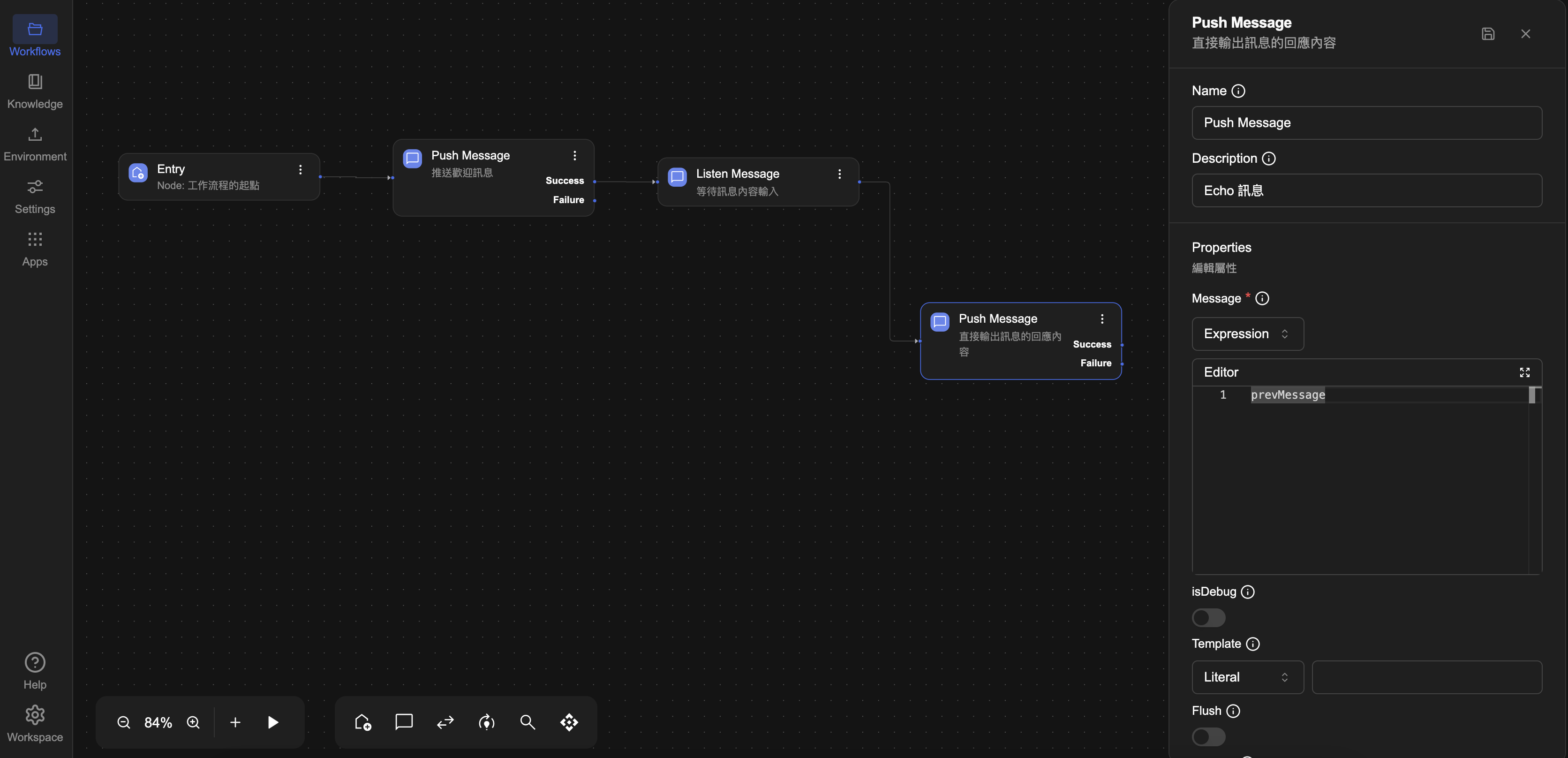 例如:上一則訊息內容、節點輸出值、使用者資訊等。透過 Expression,我們可以讓機器人的回應不再是靜態文字,而是根據實際輸入產生對應輸出,實現更具互動性的自動化流程。