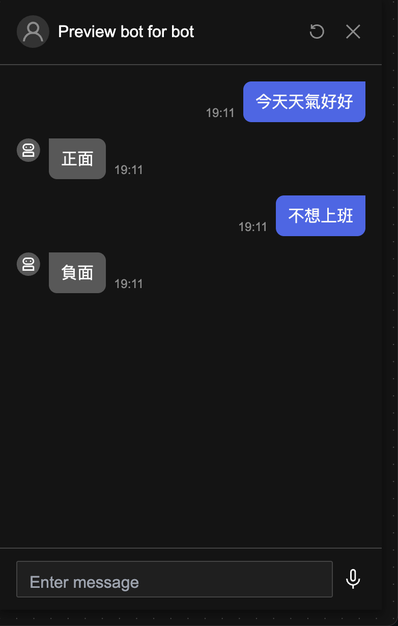 測試輸入情緒偏正面的用戶輸入,比如「今天天氣好好」,AI 可以判斷為正面; 反之,測試輸入情緒偏負面的表達,比如「不想上班」,AI 可以判斷用戶的情緒為負面。