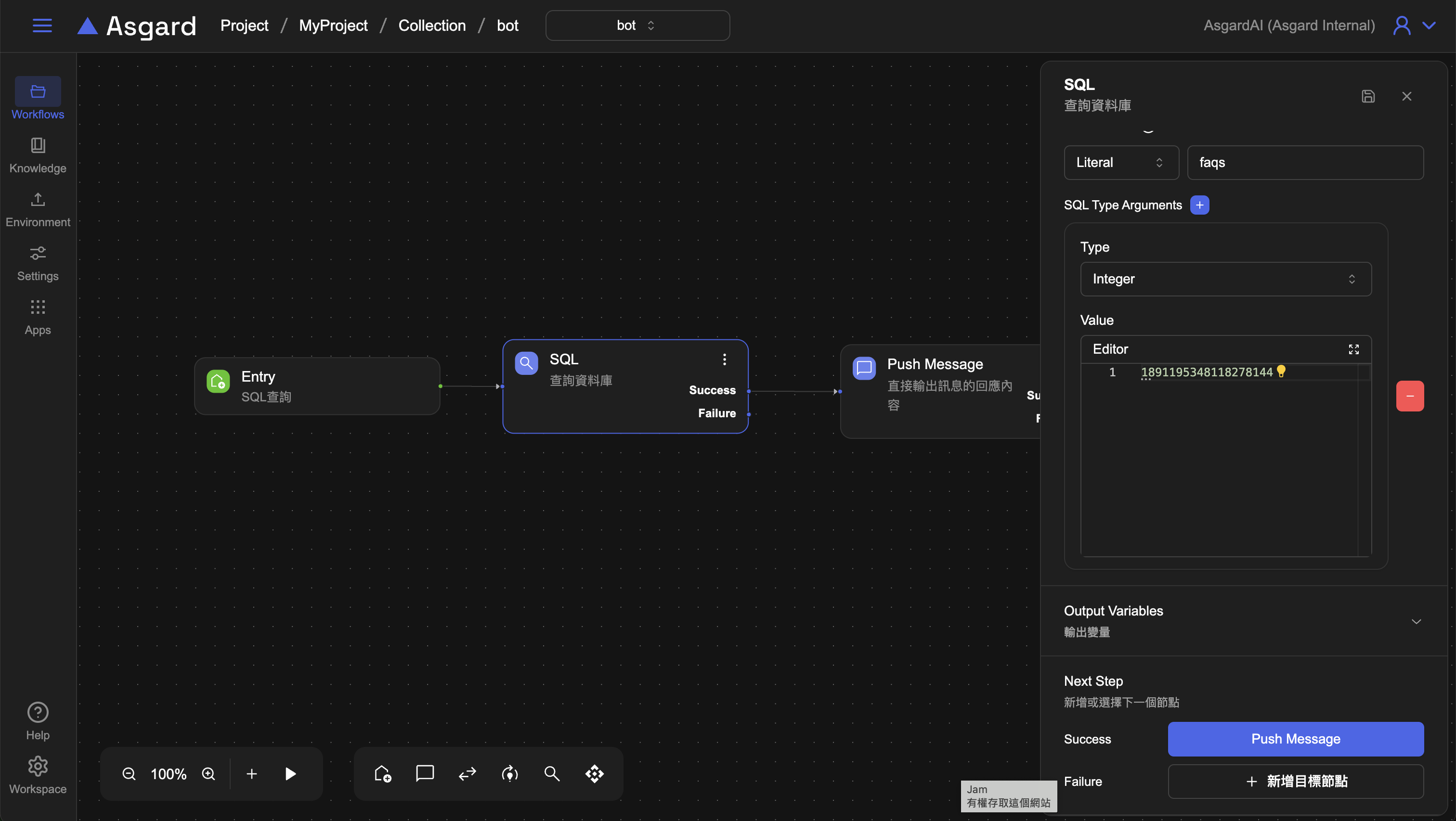 • ResultField 產生的查詢結果資料將存入的變數名稱。範例選擇Literal類型,並輸入 faqs