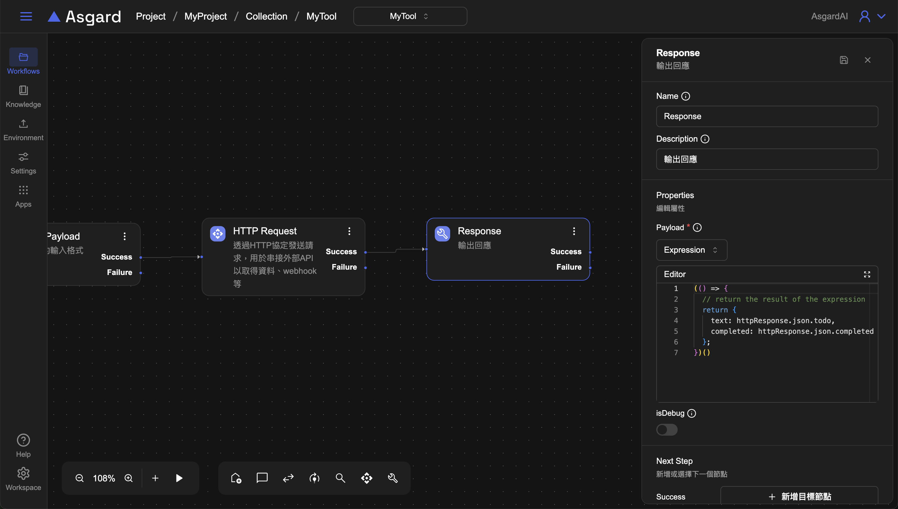 URL 處選擇 Expression 並填入 URL,這個範例需要傳入 To Do 的 id,因此在 URL 最後加上剛剛在 Validate Payload 定義的 todoId: