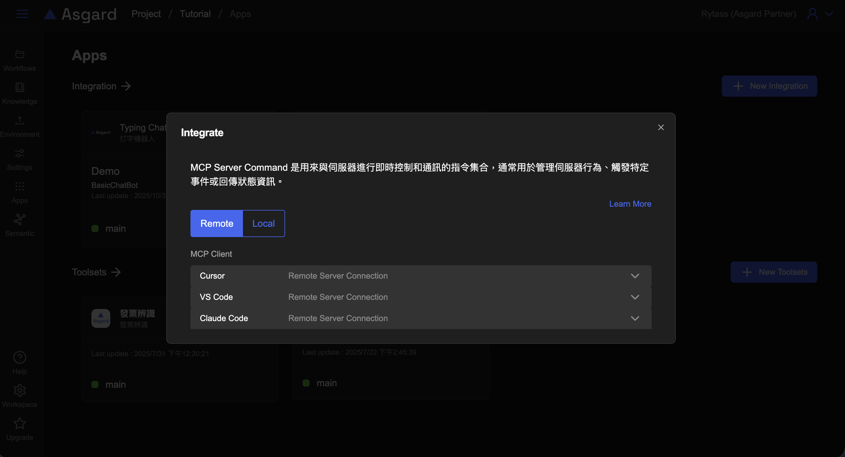 Asgard 提供遠端 MCP 設置,可以在 MCP Client 直接調用 Asgard Toolsets,不必另外安裝 Asgard MCP Server 應用程式。