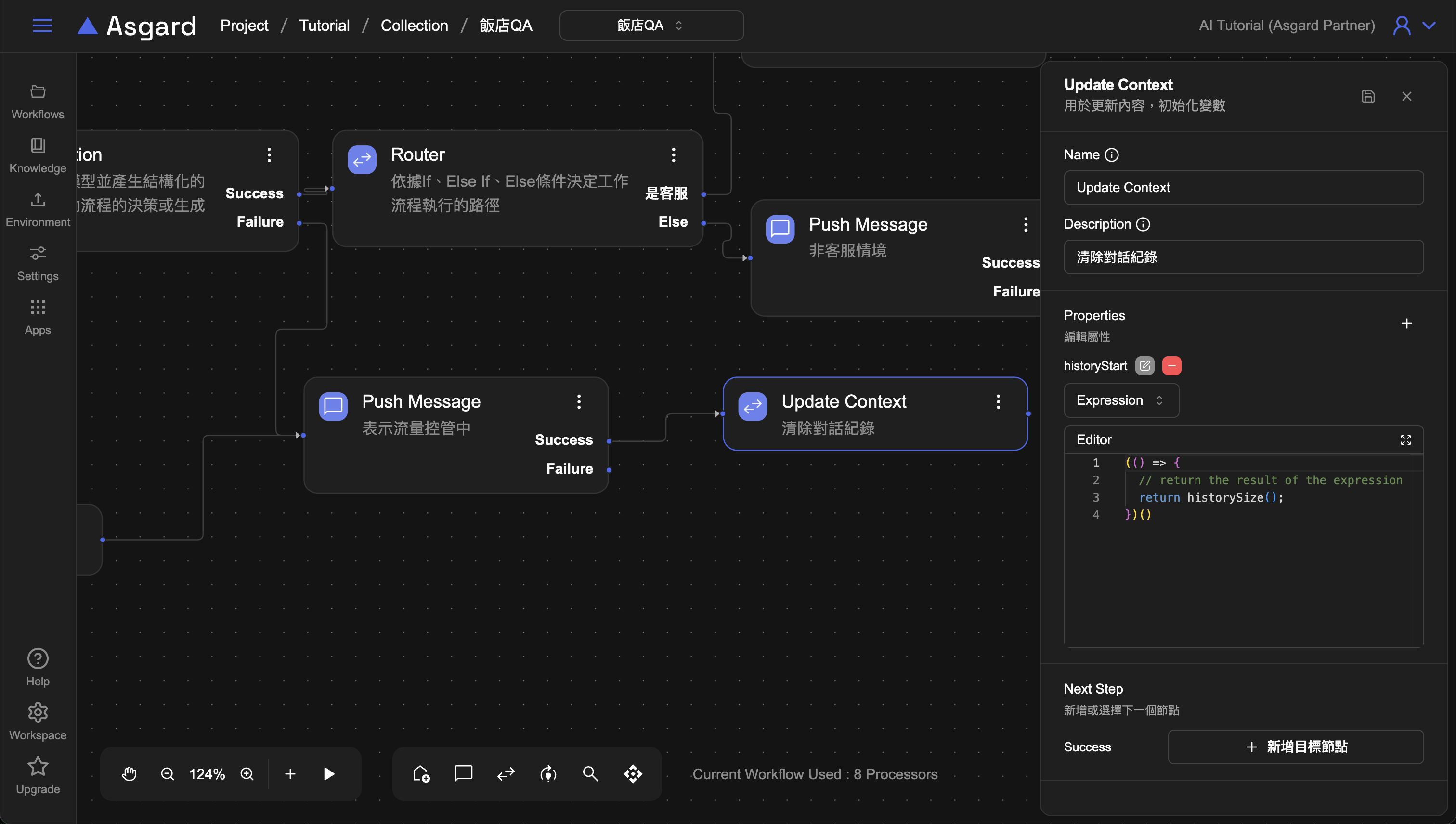 historySize為 Asgard 內建函數,historyStart 為先前在 Update Context 裡所新增的變數,historySize 是指訊息的總量,每一則訊息都會記算一筆,算到上一個對話為止,因此這裡是將 historyStart 更新為 historySize,藉此清除歷史對話訊息。