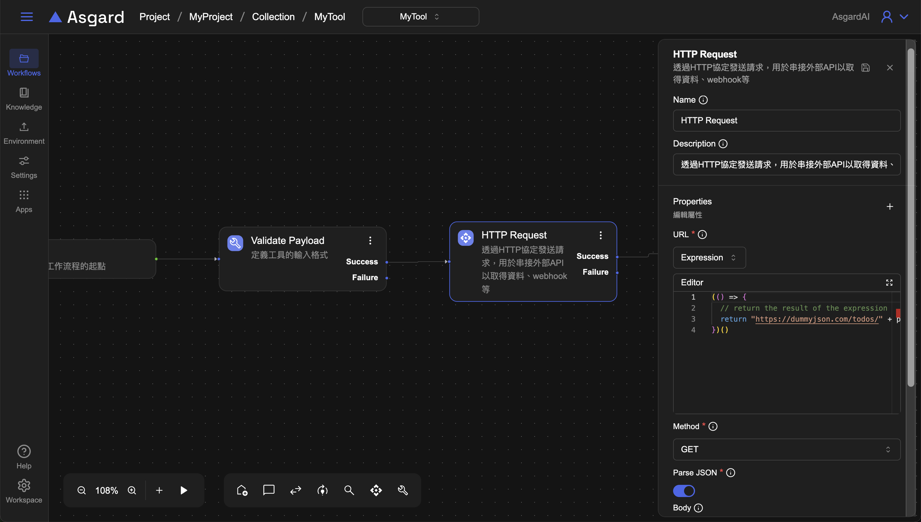 URL 處選擇 Expression 並填入 URL,這個範例需要傳入 To Do 的 id,因此在 URL 最後加上剛剛在 Validate Payload 定義的 todoId: