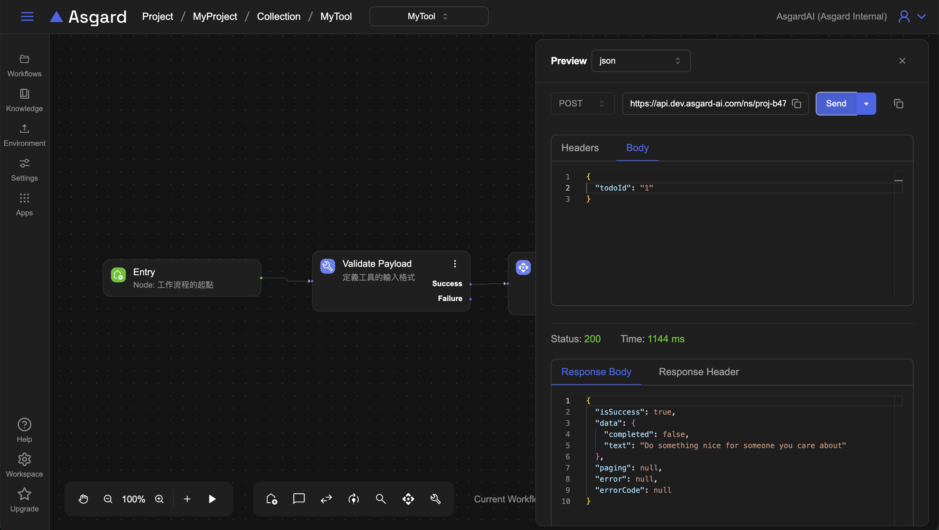 點擊 preview 來實際存取該 API 測試,類型請選 JSON,在 Body 的地方,可以看到剛剛規定需要輸入的 to do id,此處輸入「1」後點擊 Send。底下 Response Body 可以成功拿到該 to do 清單的第一項: