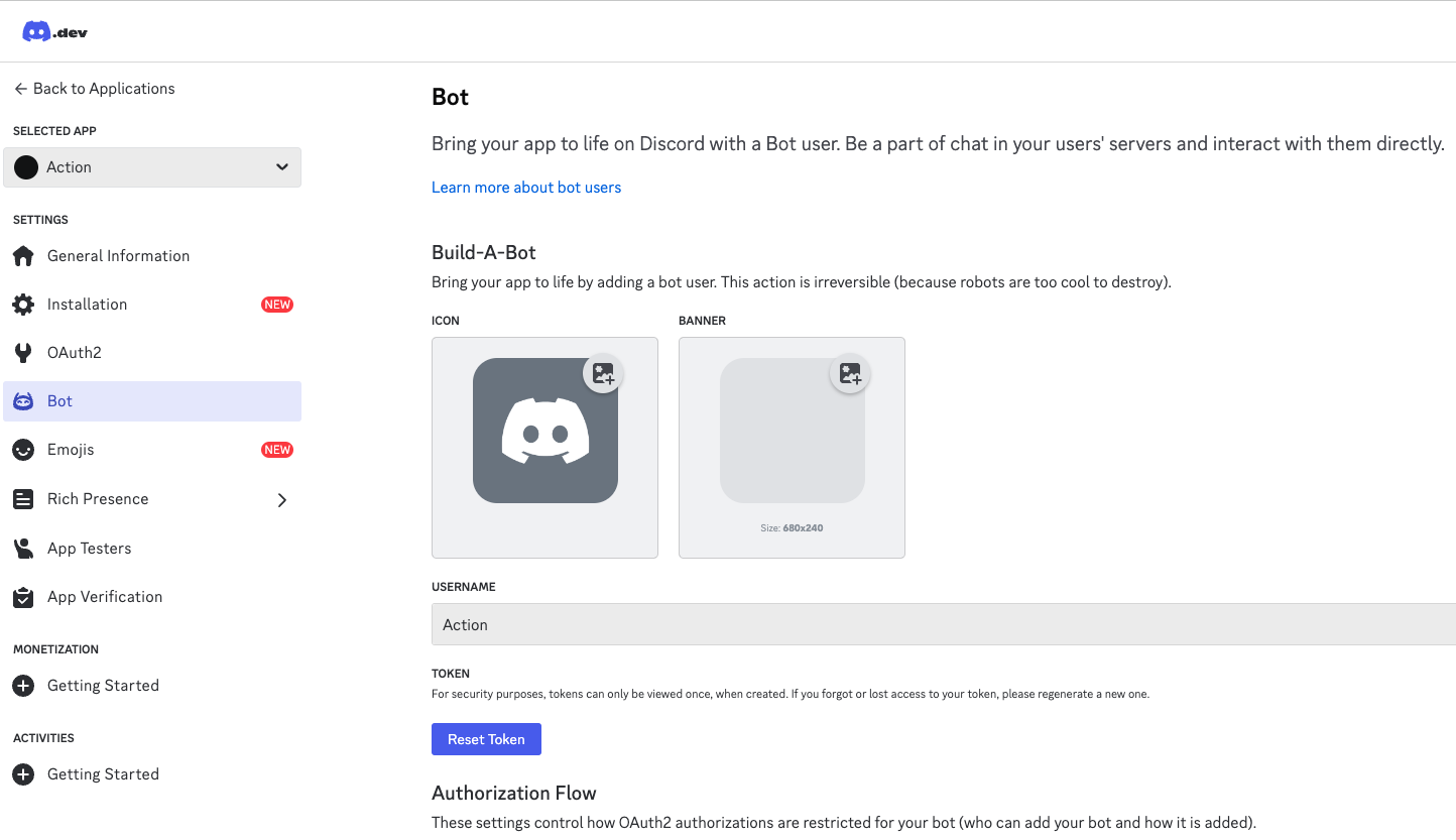 在 Discord Developer Portal 建立新應用並建立 Bot,請授權 bot 並給予對應的權限,將 bot 邀請到 Discord Server。