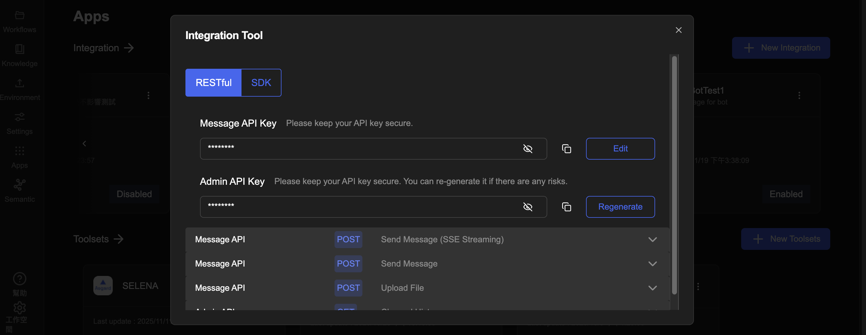 使用 Generic (Bot) 類型的應用,會提供 RESTful 與 SDK 兩種模式,可依使用情境選擇: