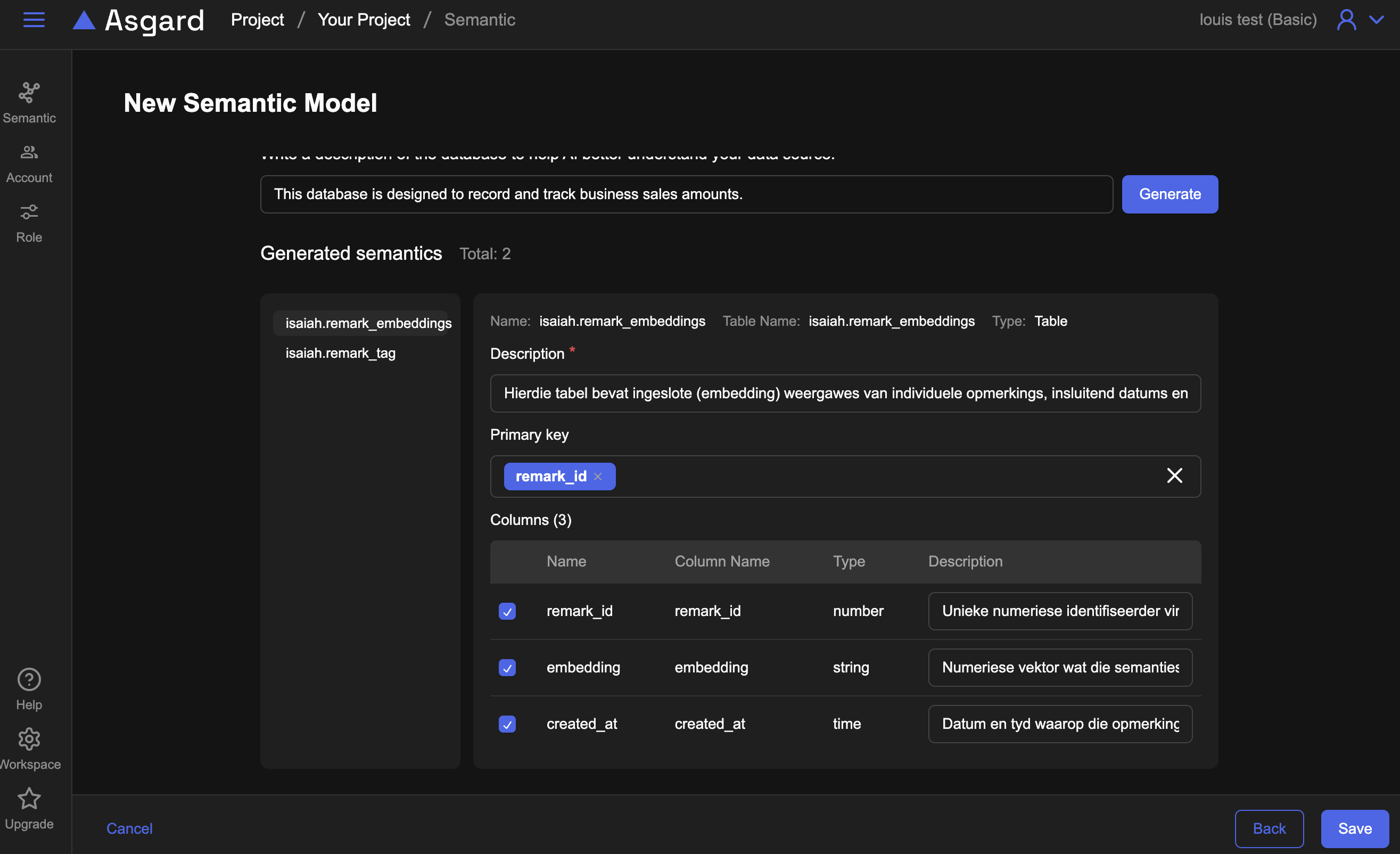 待 AI 產生每個 Table 與 Column 的說明後,即可以 review 並修改內容,如果不希望把某些 Column 放入分析範圍,可以把前方的 checkbox 取消勾選即可。另外, Table 的 Primary key 也會自動產生,如果沒有 key 可以保持不選即可。左側可以切換 Table 設定,記得每個 Table 都要設定完才按儲存。