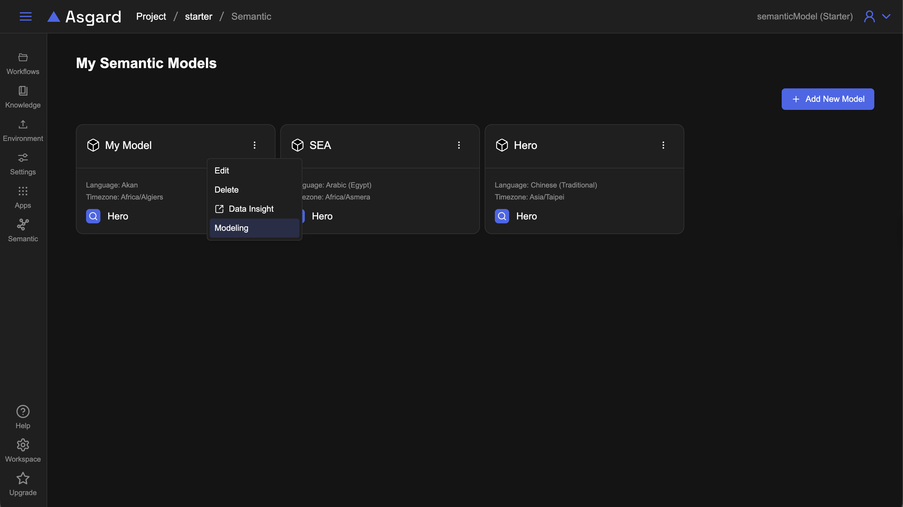 直接點擊開啟 Data Insight 功能,參考Data Insight簡介。也可以點擊箭頭開啟 Edit Model 編輯當前 Semantic Model 基本資訊,參考管理語意資料模型