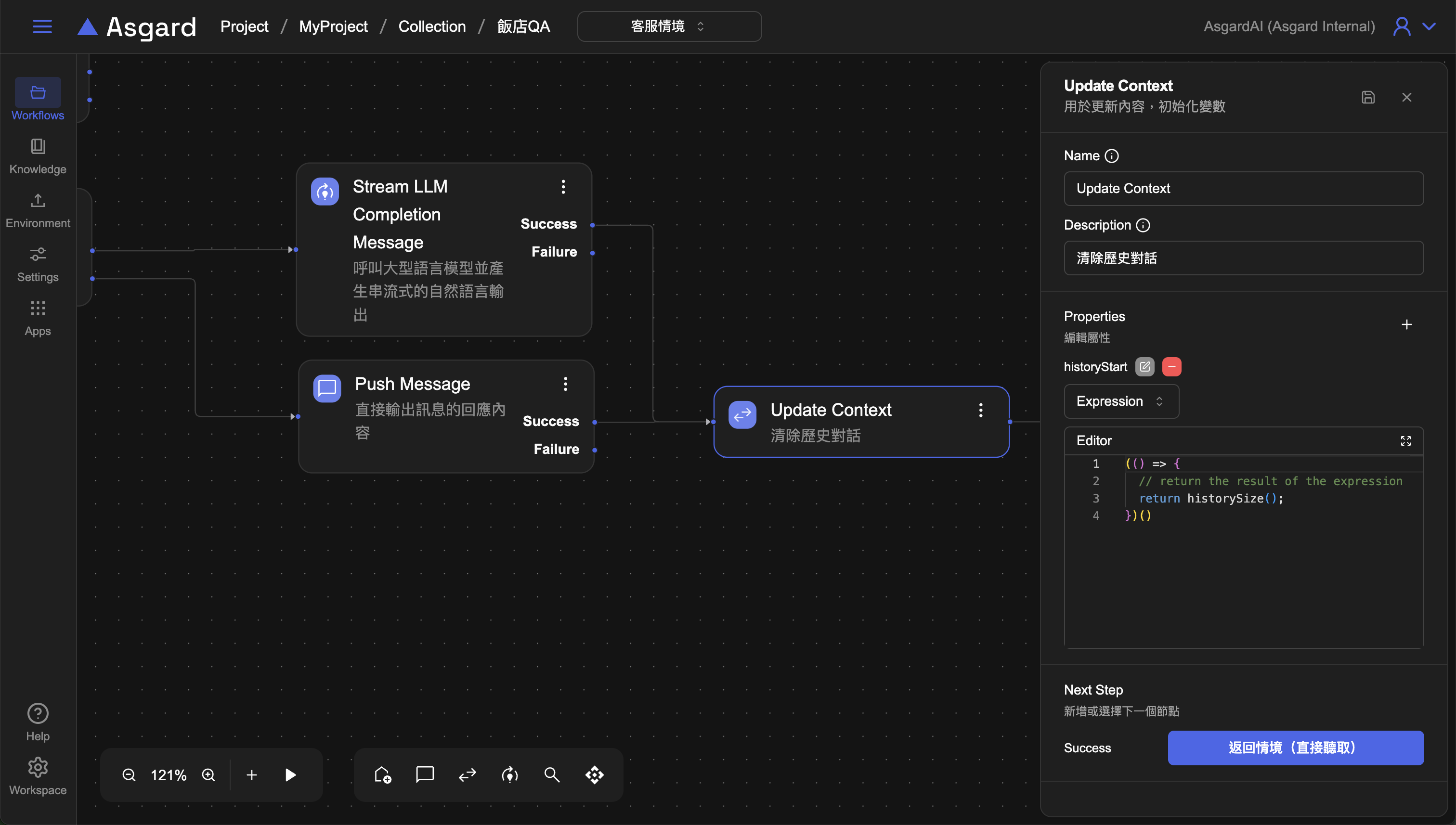historySize為 Asgard 內建函數,historyStart 為先前在 Update Context 裡所新增的變數,historySize 是指訊息的總量,每一則訊息都會記算一筆,算到上一個對話為止,因此這裡是將 historyStart 更新為 historySize,讓 AI 從新一輪的對話開始。
