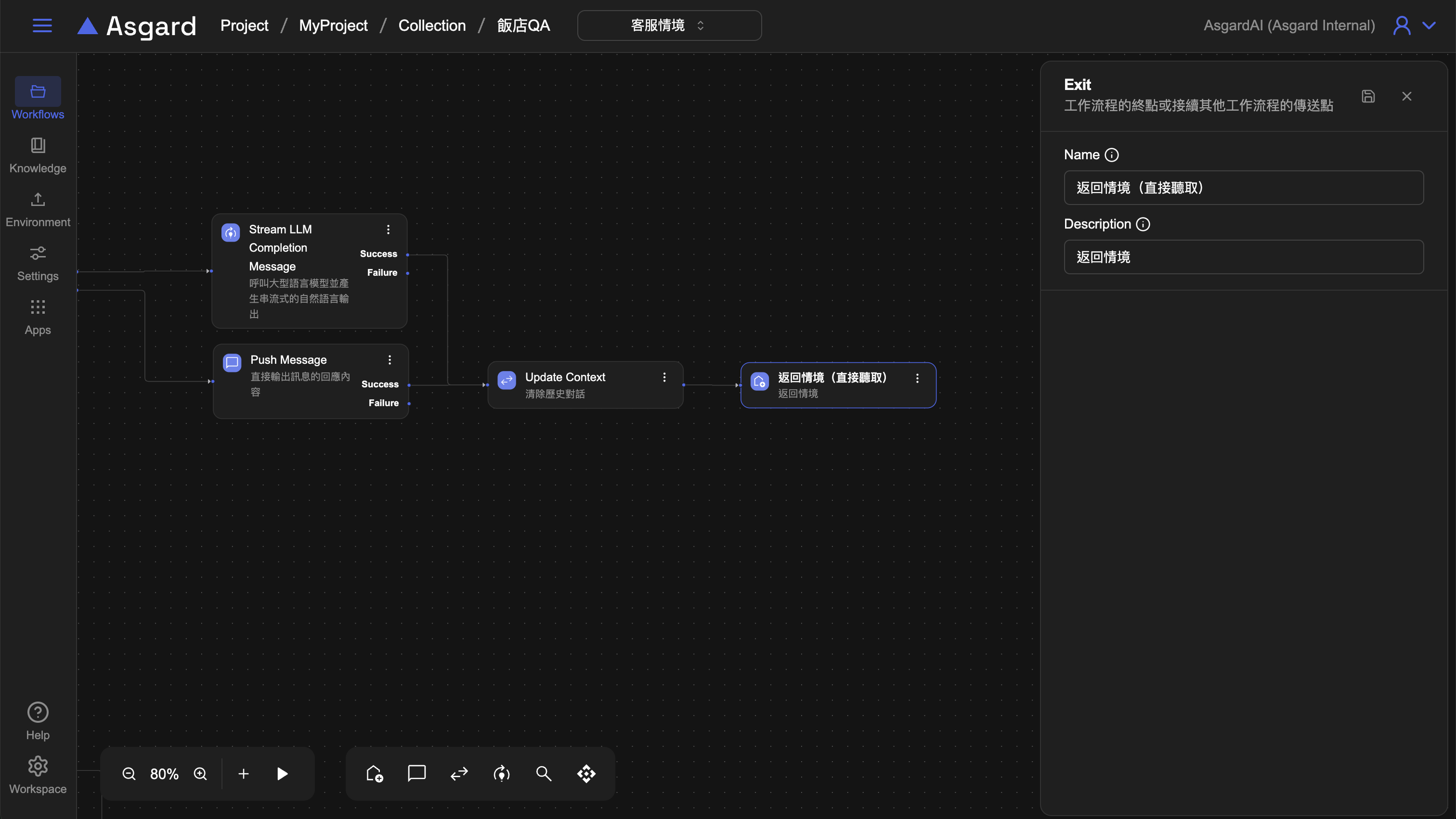 點擊上方「飯店QA」名稱返回Collection可以看到剛剛分別在飯店QA與客服情境裡新增的Exit與Entry,將 Exit 與 Entry 連接便完成了 AI 找不到回答的流程處理,並能將用戶導向到先前設計的 Listen Message 去聆聽用戶問題並判斷是否為客服情境。