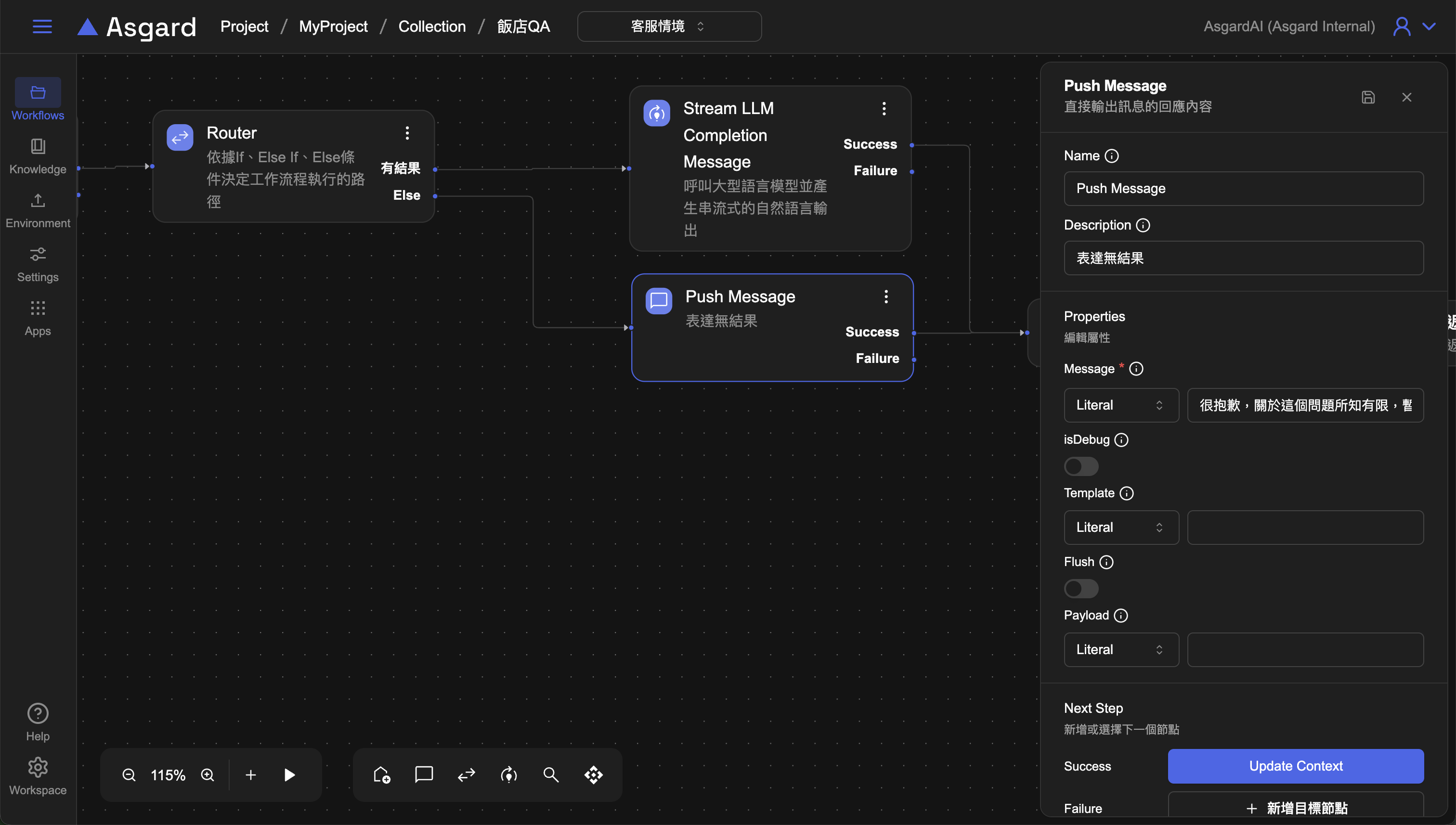 刪除上一章節第五步的 Push Message 並加上 Router 來判斷是否有 Retrieve Knowledge 的結果。