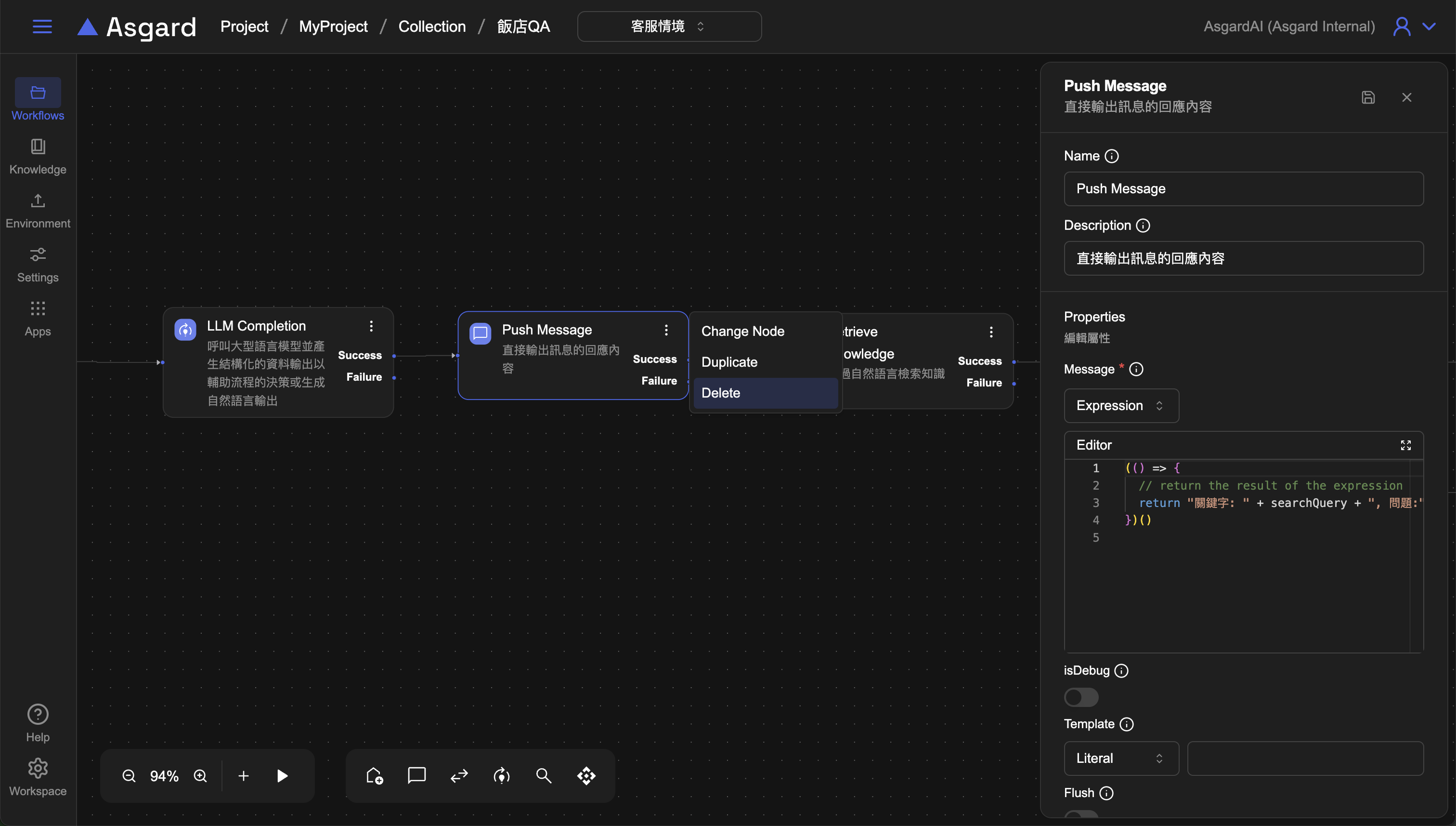 由於工作流程已能按照期望的流程執行,我們可以將確認用的 Push Message 移除,保持客服 AI 回答時的畫面簡潔。