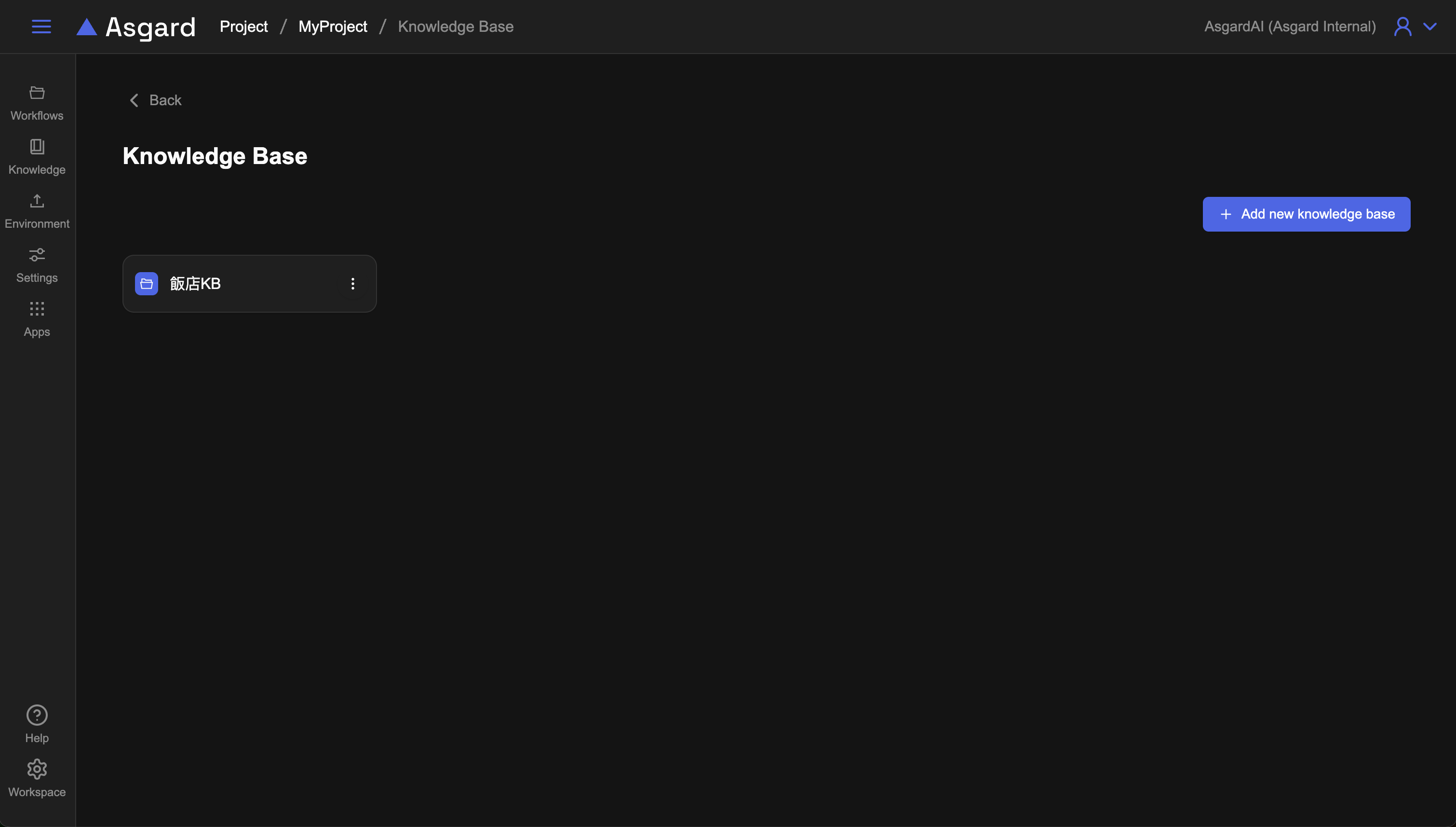 在左側的功能列點擊 Knowledge,這邊是知識庫(Knowledge Base)的功能,操作就像資料夾一樣簡單,首先我們先為飯店 QA 的 AI 客服建立一個專用的知識庫,點擊「Add New Knowledge Base」新增一個空白的知識庫。
