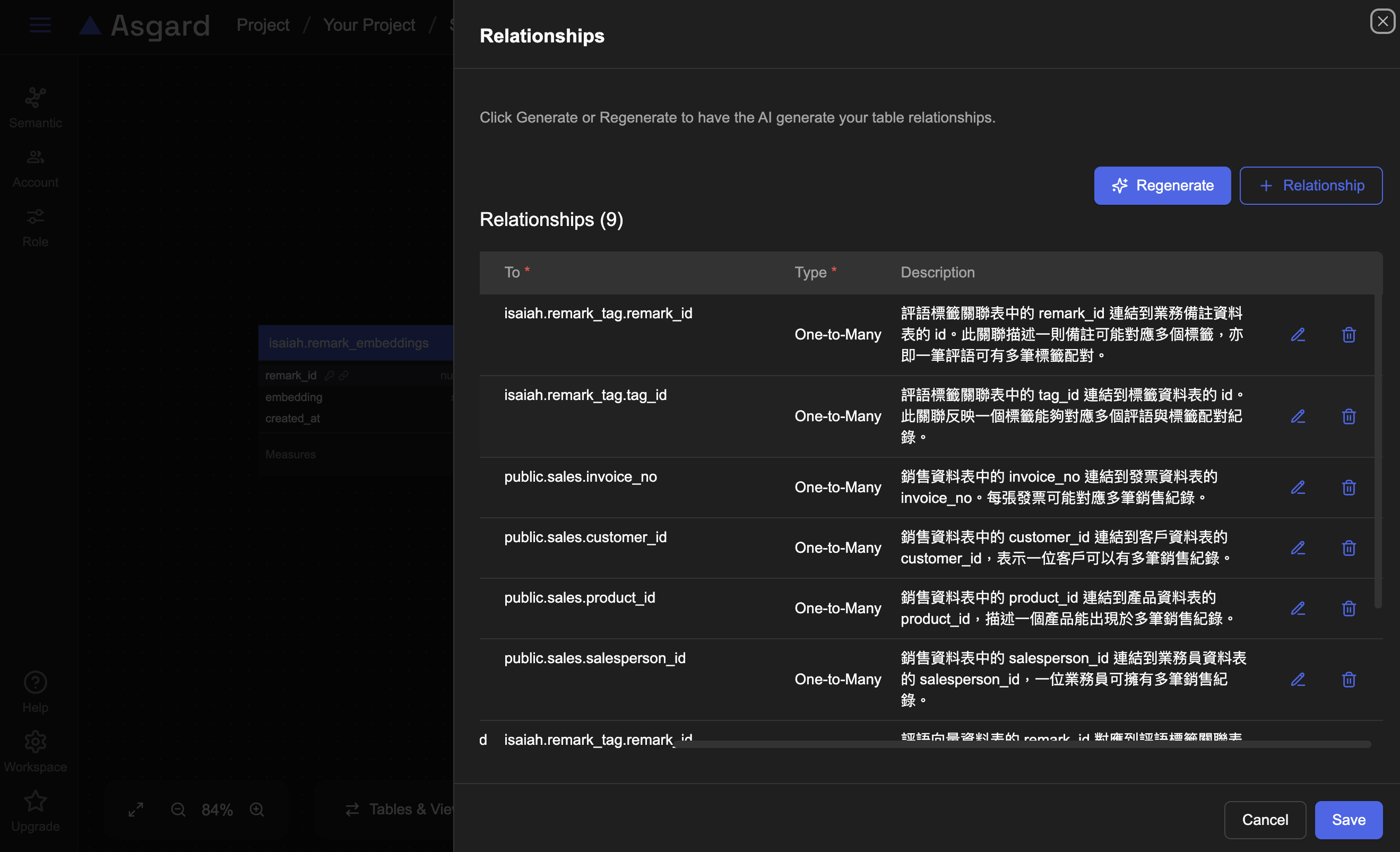 Relation 是資料表之間的關聯性 (例如訂單表與客戶表的連結),在 Semantic Layer 中設定 Relation,可以幫助 AI 理解不同資料表之間的邏輯關係,讓查詢與圖表生成更正確。